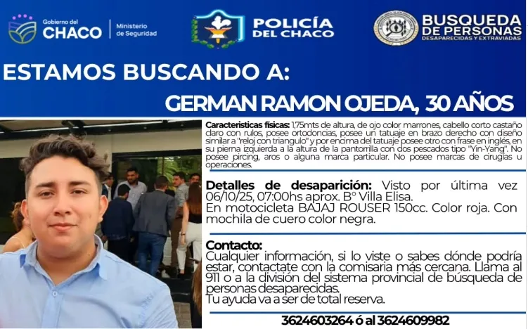 La Policía del Chaco y el Ministerio de Seguridad provincial solicitan la colaboración de la comunidad para dar con el paradero de Germán Ramón Ojeda, un hombre de 30 años que fue visto por última vez el lunes 6 de octubre alrededor de las 7:00 en el barrio Villa Elisa de Resistencia. Según informaron las autoridades, Ojeda se movilizaba en una motocicleta Bajaj Rouser 150 cc de color roja y llevaba consigo una mochila de cuero color negra.