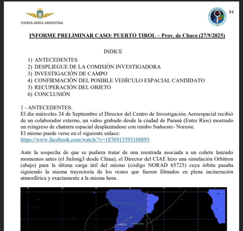 Dicho informe menciona que se trata de un objeto perteneciente al cohete chino Jielong-3 cuyos restos incinerándose fueron filmados horas antes de su caída por vecinos de Paraná, Entre Ríos.